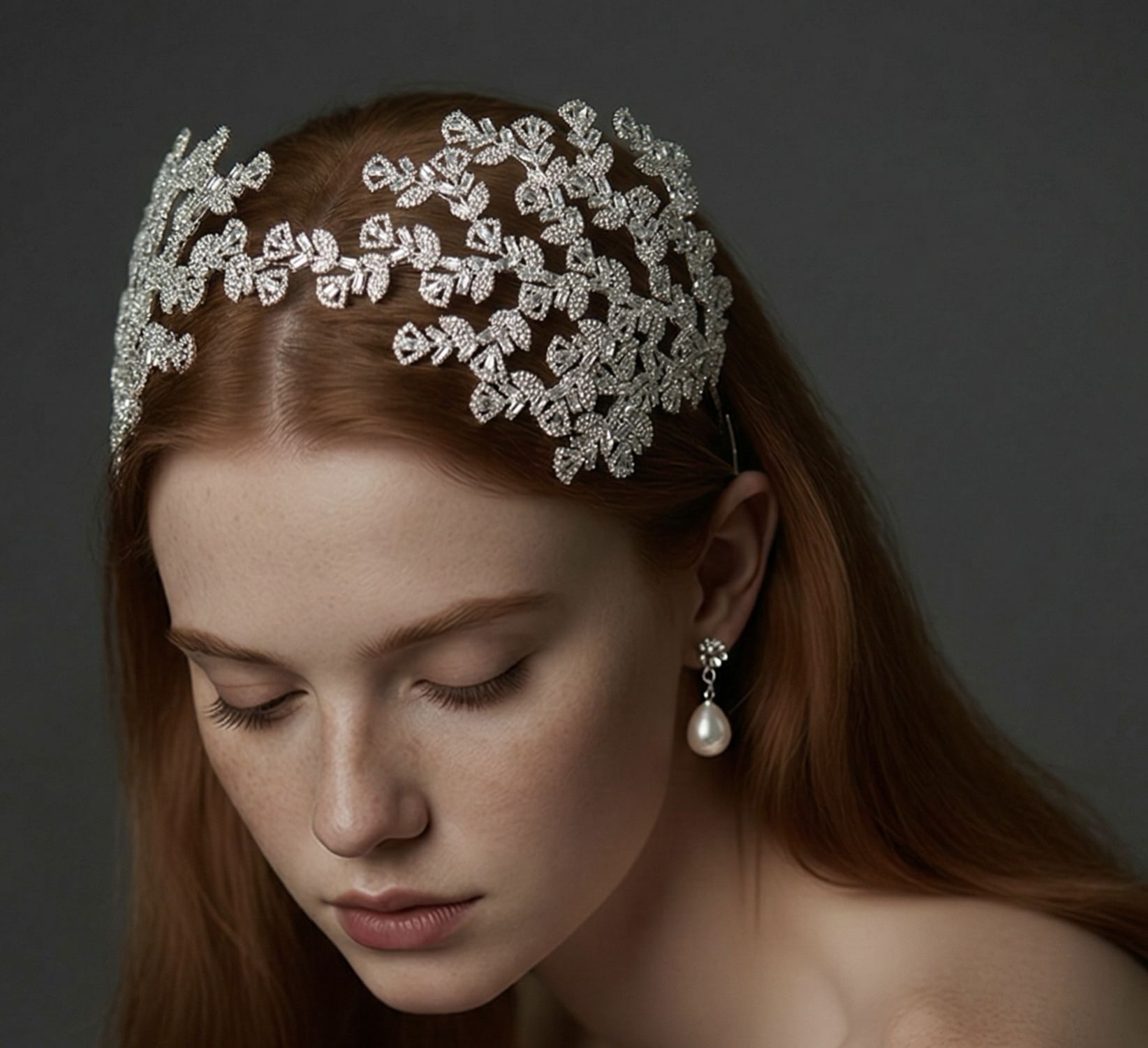 تصميم عريض ومهيب يتميز بزخارف هندسية وكريستالات مكثفة، مصمم خصيصاً لتكوني ملكة متوجة في ليلة العمر