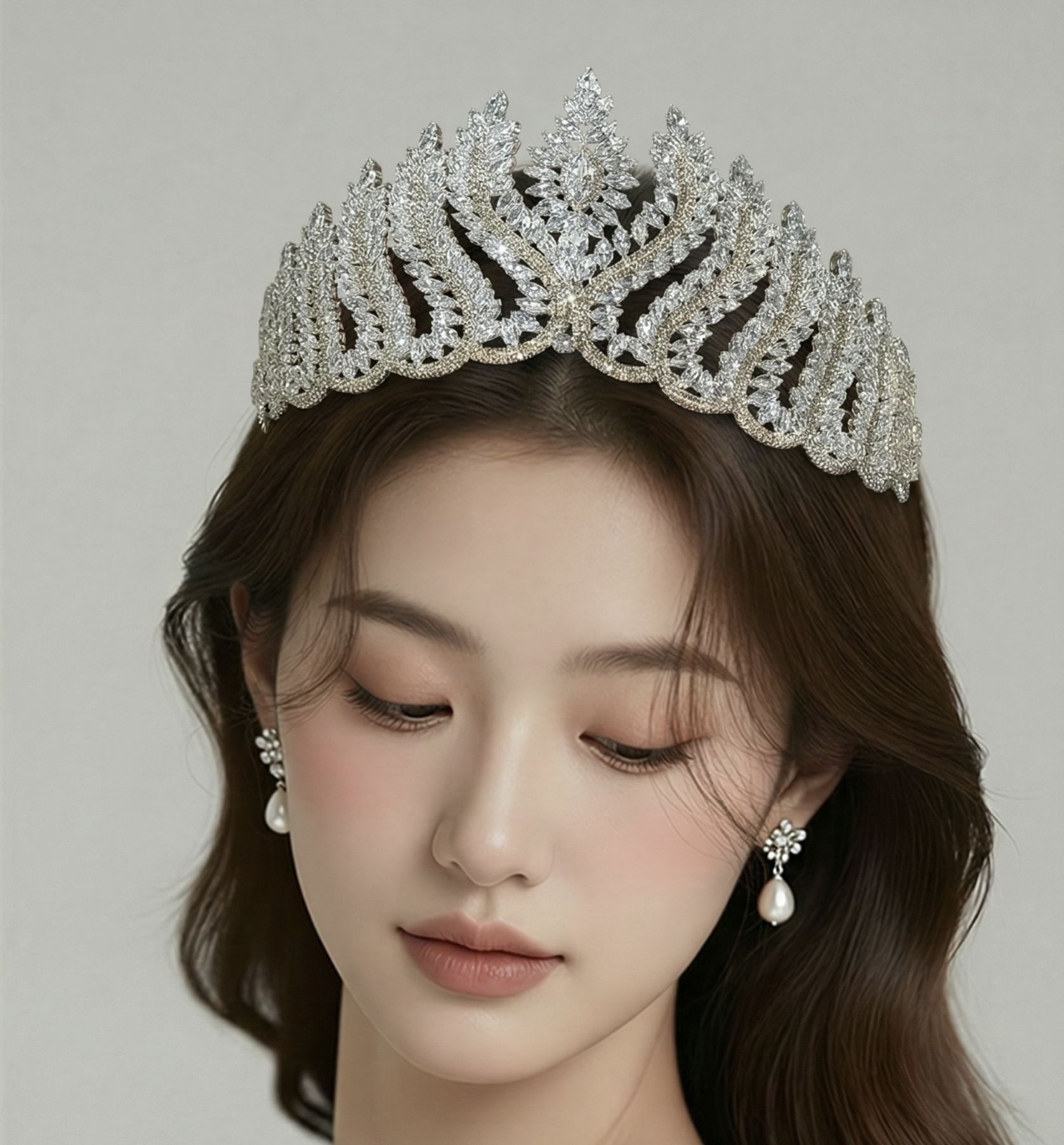 تاج فاخر بتصميم مستوحى من أغصان الطبيعة المتلألئة، مرصّع بكريستالات دقيقة على شكل أوراق متفرعة تعطي إحساس ملكي ناعم. يتخلله لآلئ بيضاء ناعمة موزعة بشكل متوازن تضيف لمسة أنثوية راقية. الأحجار تعكس الضوء من جميع الزوايا لتعطي بريق هادئ وفخم بدون مبالغة. صناعة دقيقة جداً بخيوط معدنية ثابتة تضمن المتانة والخفة على الرأس. مثالي للعرايس ومحبات الإطلالة الهادئة الملكية