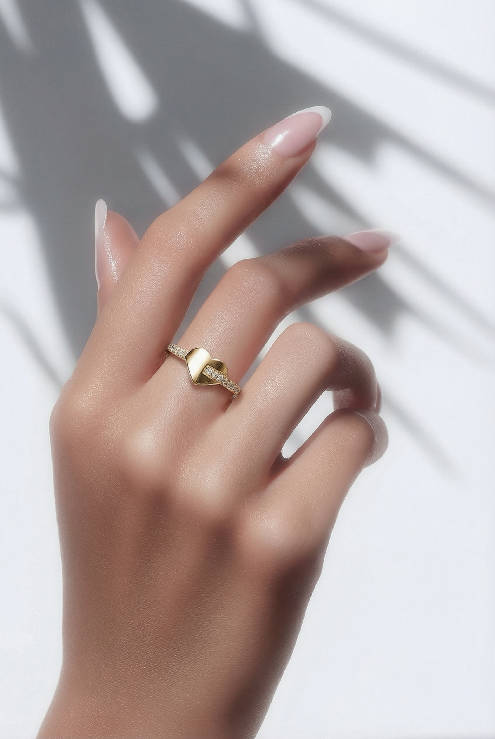 حلقة ذهبية رفيعة تتوسطها أيقونة "قلب" بسيطة ومصقولة، لتكون تذكيراً يومياً ناعماً بالحب والجمال البسيط. اللون مكفول
