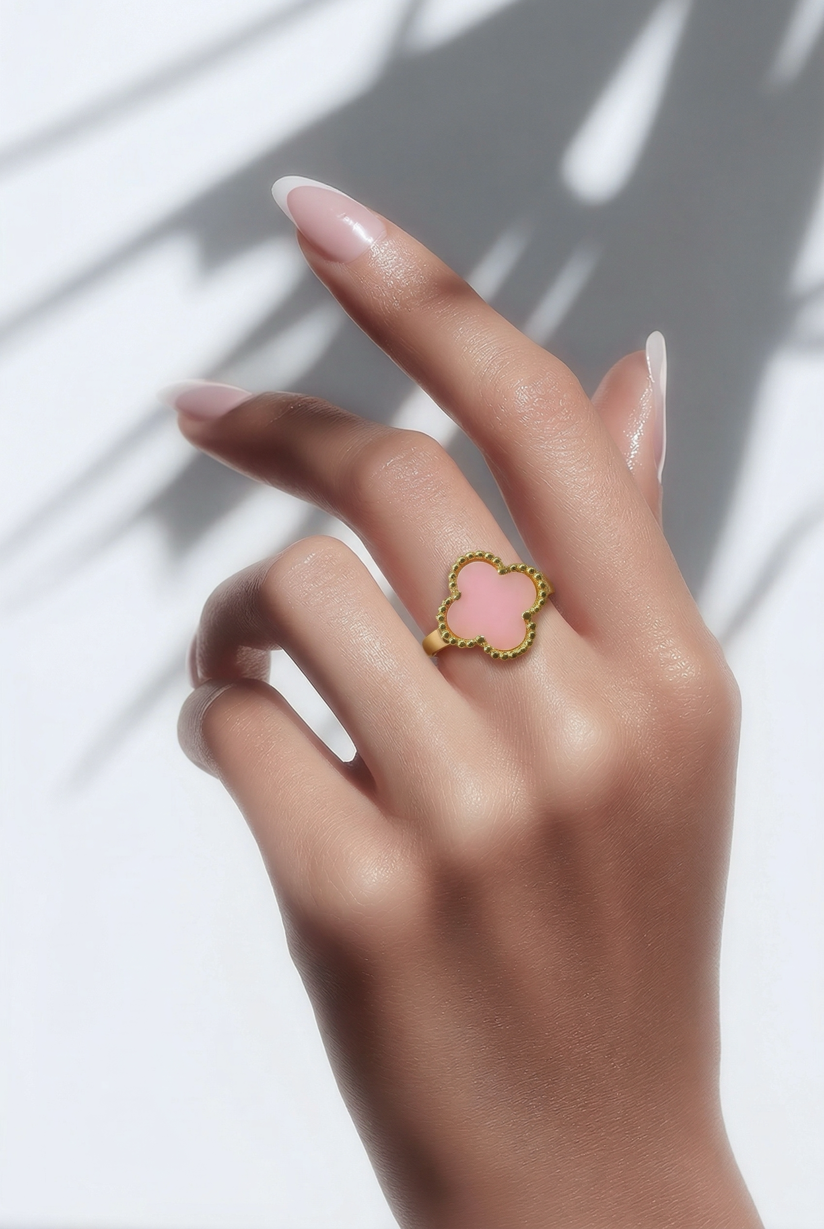 باللون الوردي الهادئ، يعطي طابعاً أنثوياً ناعماً جداً، وكأن قطعة من الزهر استقرت على إصبعك. اللون مكفول