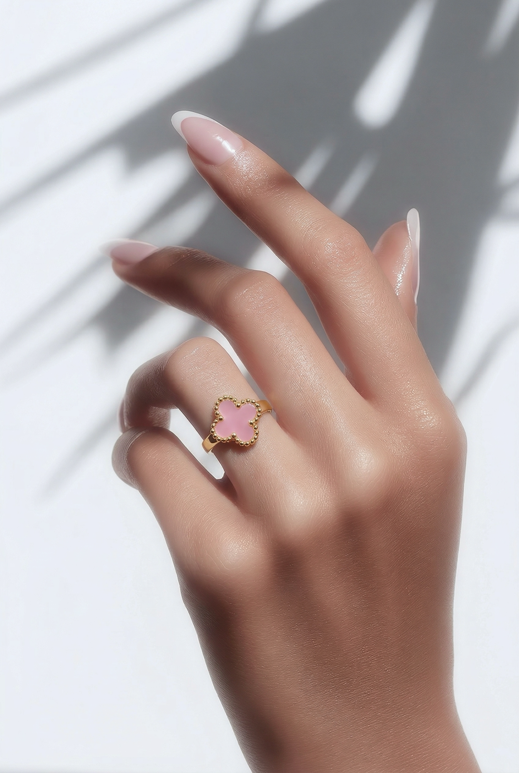باللون الوردي الهادئ، يعطي طابعاً أنثوياً ناعماً جداً، وكأن قطعة من الزهر استقرت على إصبعك. اللون مكفول