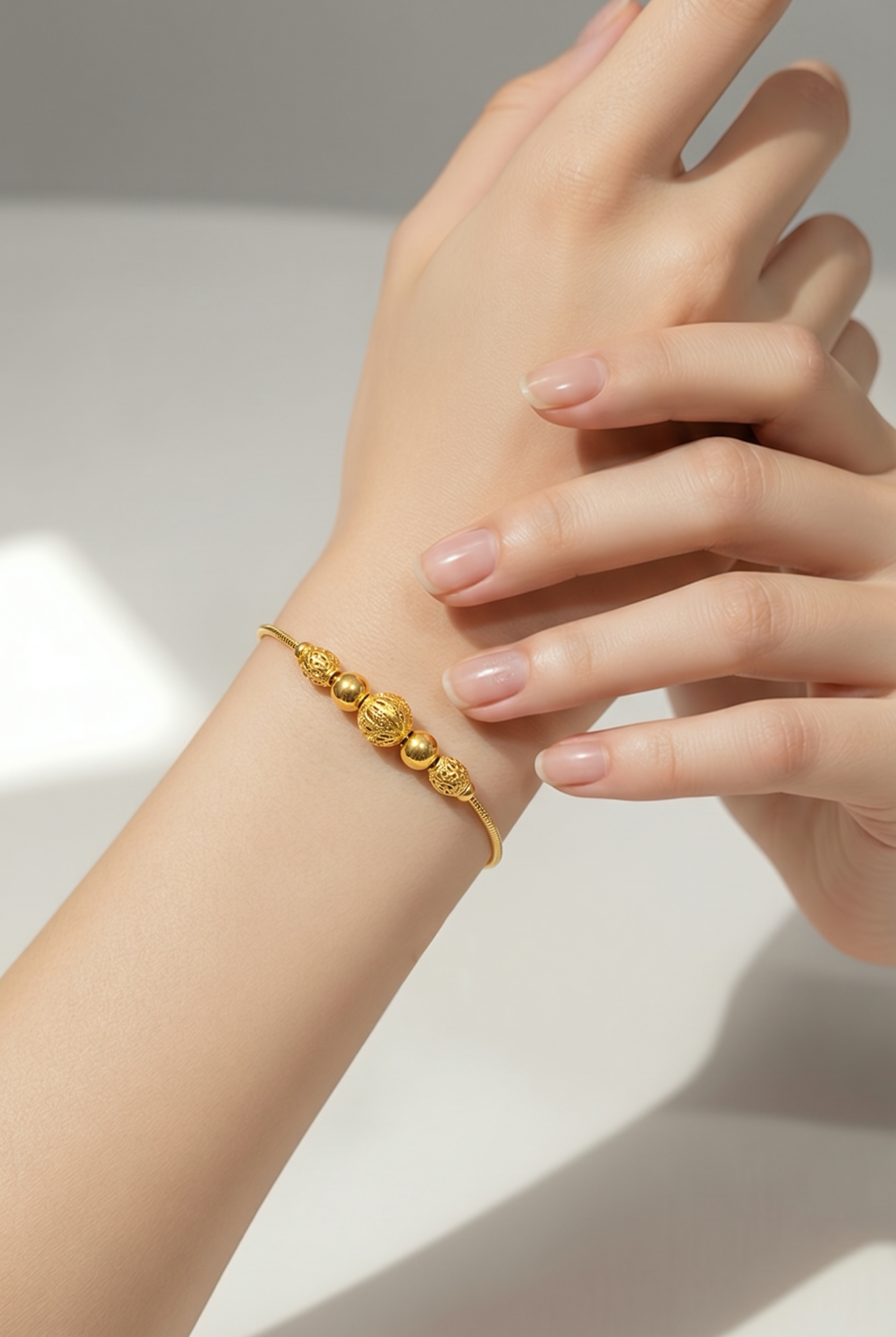 سوار رقيق جداً (سلكي) يتوسطه مجموعة من الخرزات الذهبية المزخرفة بنقوش يدوية دقيقة (Filigree). اللون مكفول