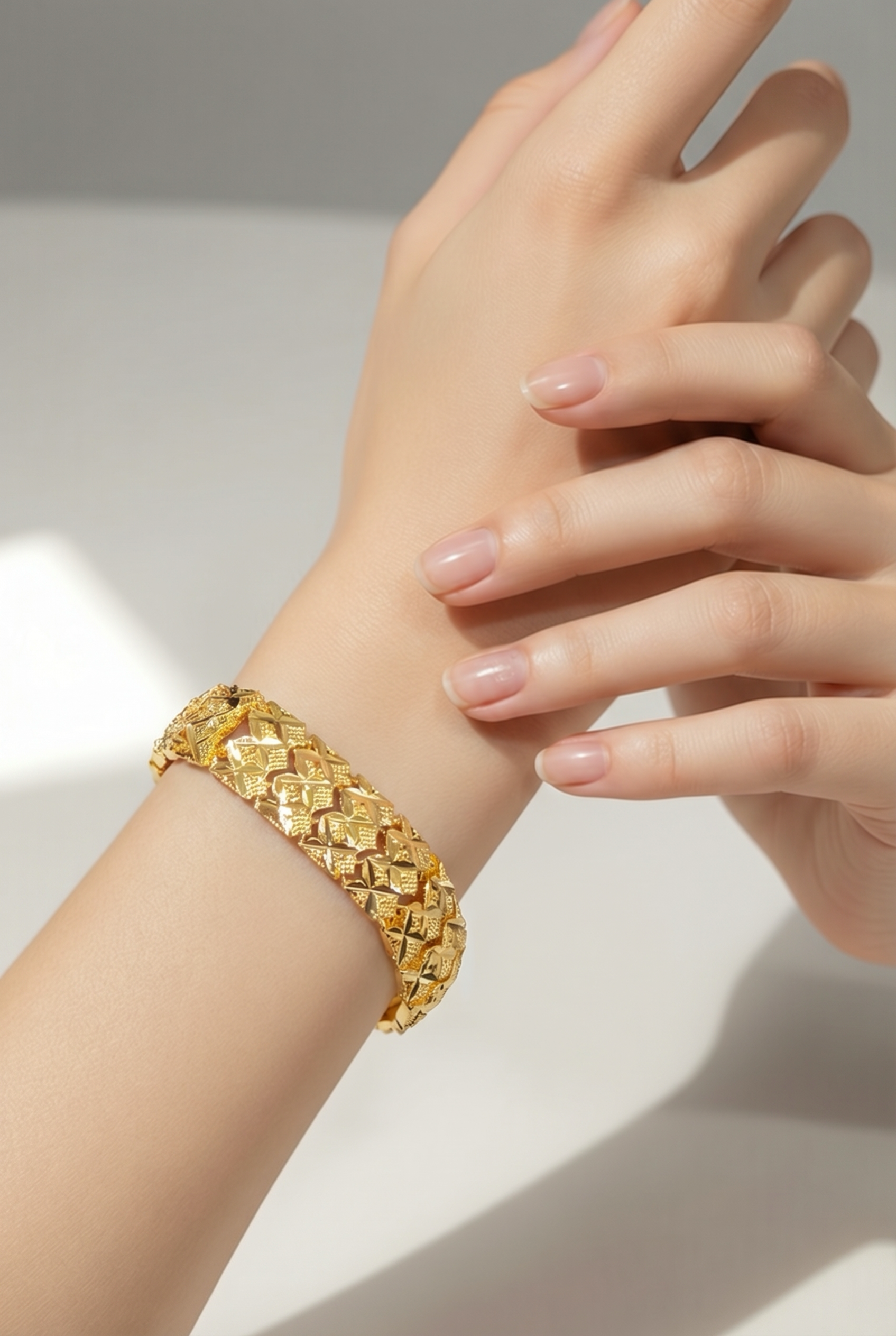 سوار عريض بلمسة نهائية "مات" (مطفيّة) مع حواف مقصوصة بدقة لتعكس الضوء وكأنها مرصعة بالألماس الصغير.