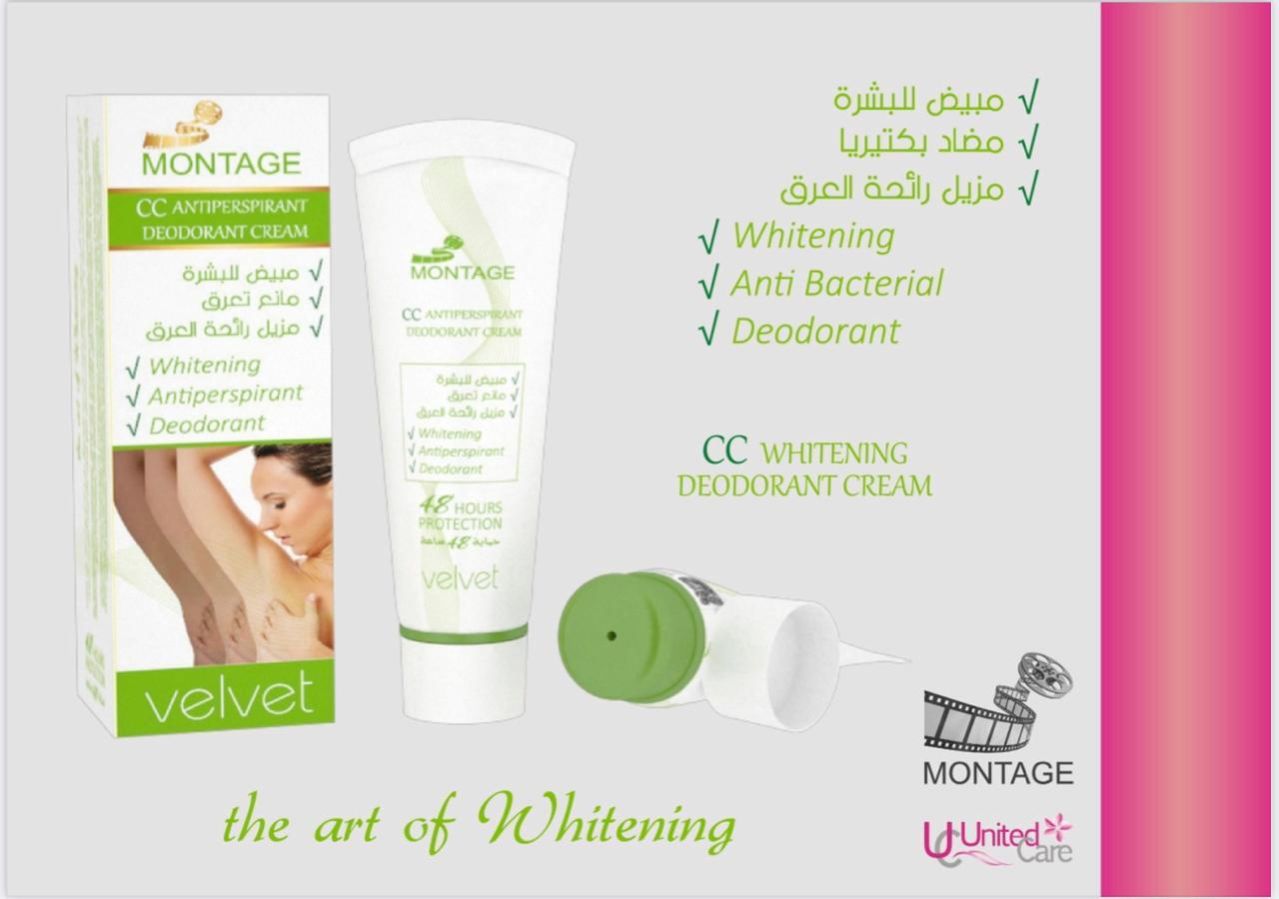 كريم مونتاج ...رائحة ڤلڤت مبيض لـ لون البشره و مزيل رائحة العرق يمنحك عطر لطيف و حمايه تدوم 48 ساعه ومضادللتعرق كريم مونتاج يحسن مظهر وملمس البشرة كما يفتّح لون البشره الداكنة نتيجة الاحتكاك اليومي و الحلاقة لبشره افتح و بلون موحد كريم مونتاج للنساء والرجال النتائج مضمونه 100%