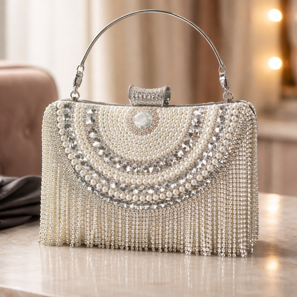 شنطة رسمية فخمة بتصميم أنيق يلفت النظر، مزينة بحبات لؤلؤ ولمعة كريستال ناعمة بتعطيها طابع راقي ومميز. مثالية للمناسبات، الأعراس والسهرات، حجمها عملي بيكفي أساسياتك مع لمسة فخامة بتكمل إطلالتك. تيجي بمقبض مريح وسلسلة لسهولة الحمل حسب اللوك اللي بدك إياه. اختيارك الأمثل لإطلالة أنثوية فخمة بدون مجهود