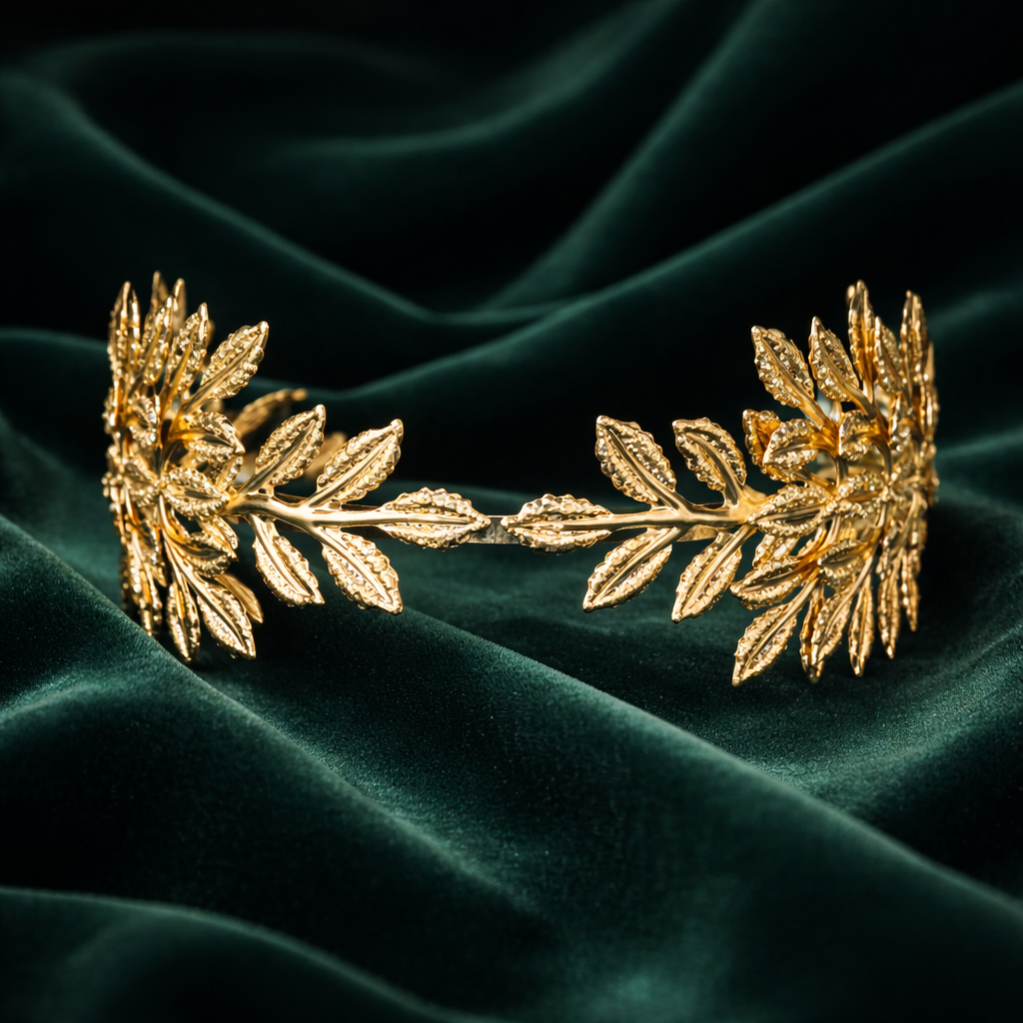 إكسسوار شعر فاخر مستوحى من أوراق الغار الملكية، بتصميم أنيق يرمز للقوة والجمال في نفس الوقت. يتميز بتفاصيل ذهبية دقيقة ولمعة راقية بتضيف لمسة فخمة لأي إطلالة. مثالي للعروس أو للمناسبات الخاصة، خاصة حفلات الحناء، ليعطيك حضور مميز وأسلوب يجمع بين التراث واللمسة العصريّة