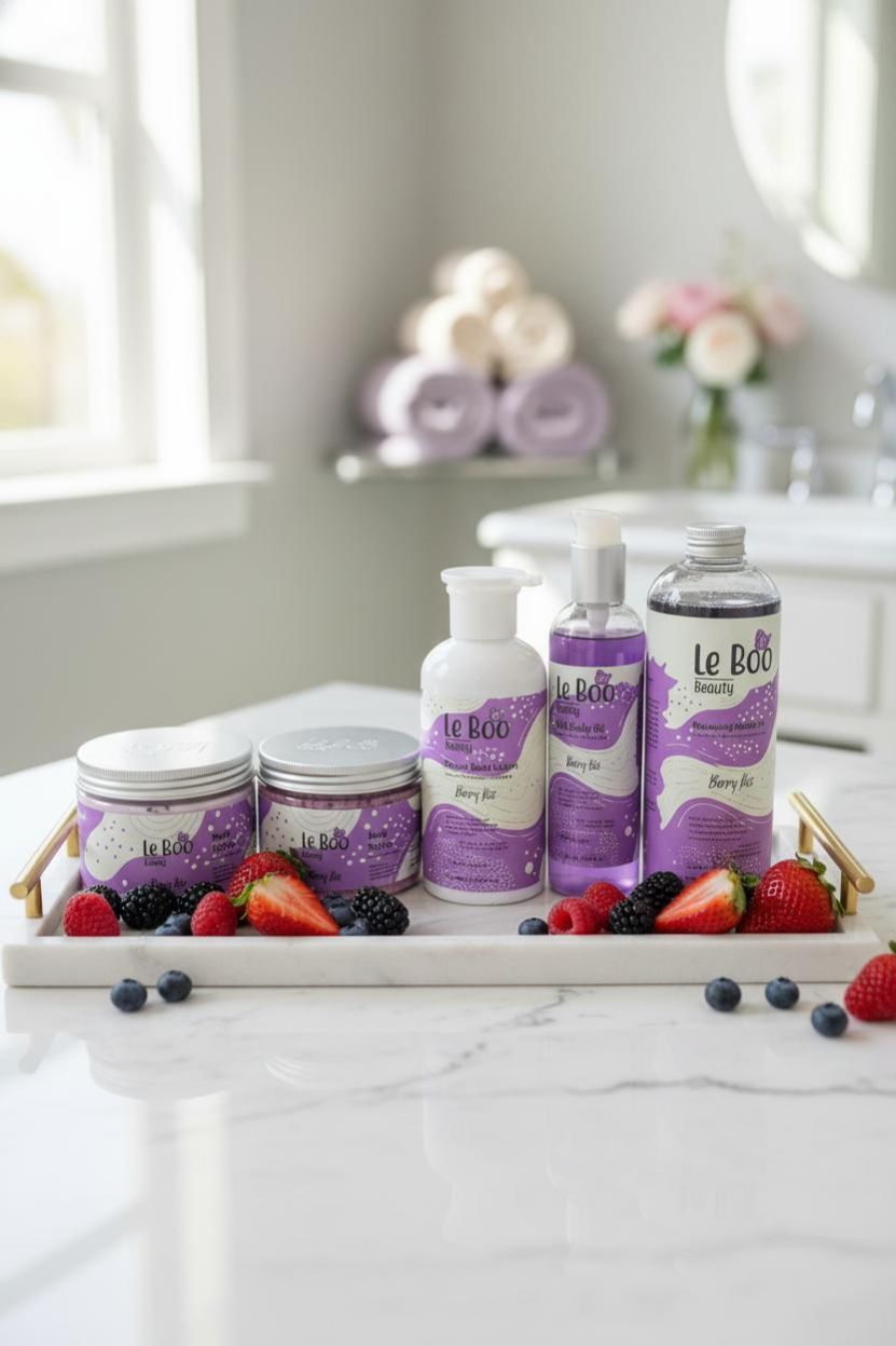 لي بو بكج الجسم برائحة البيري مكون من 5 قطع: شاور جل حجم 500 مل* مقشر السكر حجم 300مل* بدي لوشن حجم400 مل* زبدة للجسم حجم 300مل* زيت الجسم حجم 250 مل*