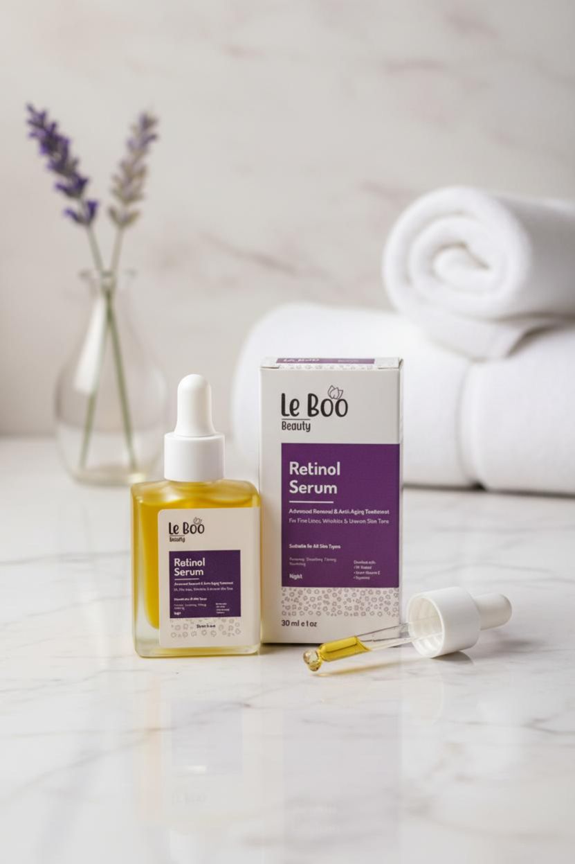سيروم الريتينول من Le Boo الوصف : سيروم علاجي يحتوي على ريتينول بتركيز 1%، يعمل على تحفيز تجدد الخلايا، تحسين مظهر الخطوط الدقيقة والتجاعيد، وتوحيد لون البشرة. يساهم في تحسين نسيج البشرة وتعزيز مظهرها الصحي مع الاستخدام المنتظم. المكونات الفعالة وآلية عملها: • Retinol 1%: مشتق من فيتامين A، يحفّز دوران الخلايا ويقلل علامات التقدم بالسن والتصبغات. • Squalane: مرطب داعم لحاجز البشرة، يقلل فقدان الماء دون التسبب بانسداد المسام. • Vitamin E (Tocopherol): مضاد أكسدة يحمي البشرة من الإجهاد التأكسدي. نوع البشرة المناسب: مناسب لجميع أنواع البشرة، ويُنصح بالاستخدام التدريجي للبشرة الحساسة أو المبتدئة بالريتينول. طريقة ووقت الاستخدام: يُستخدم مساءً فقط. توضع كمية صغيرة على بشرة نظيفة وجافة، يومًا بعد يوم في البداية ثم يوميًا حسب تحمّل البشرة. ⚠️ يجب استخدام واقي شمس صباحًا أثناء فترة العلاج